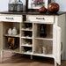 Inspired by the legendary Shaker style this dining set offers a legacy of design making and history to your home. The classic stick back design hasn't changed in centuries and with good reason, it offers a sturdy backing and an unmistakable silhouette. The turned legs are angled ever so slightly to offer a sturdier base. The table includes some upgrades like added storage shelving to the base for increased utility that is true to the shaker way of functional design. The server table offers up a unified colonial feel, with shutter design doors and a weathered finish. Bring home a piece inspired by history.