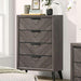 The diagonal replicated grain meet at the center line, forming a V-shaped pattern found on the front panels. Contemporary elements continue throughout this ensemble, with the black angled legs and sleek finger pulls found on the matching case goods. Coordinating pieces like this set offer a stress-free experience in updating your bedroom decor.
