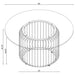 Nestled amidst the verdant embrace of potted palms, the Art Deco-inspired dining table is a modern masterpiece, its cylindrical form enshrouded by gleaming metal rods that whisper tales of Gatsby-esque opulence. A clear, tempered glass top, expansive at 60 inches, floats like a crystalline pond above the polished chrome base, inviting an array of tablescapes to dance upon its surface. Surrounding this sculptural piece, four sumptuous green velvet chairs beckon, their channel tufted backs and swiveling seats echoing the luxury of a bygone era, yet firmly rooted in contemporary comfort. The table and chairs, a marriage of retro flair and modern lines, stand as a stunning focal point, inviting guests to linger over shared meals and conversations that sparkle as brightly as the chrome finishes that bind them.