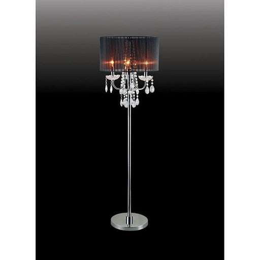 Jada Black Floor Lamp, 16"DIA X 62 1/2"H, 16lbs. A stylish black shade covers a cascading set of imported crystal droplets surrounding a metal base...