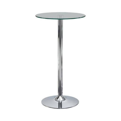 Sleek and sophisticated, this contemporary bar table features a round tempered glass top and polished chrome pedestal base. A stylish fit for moder...
