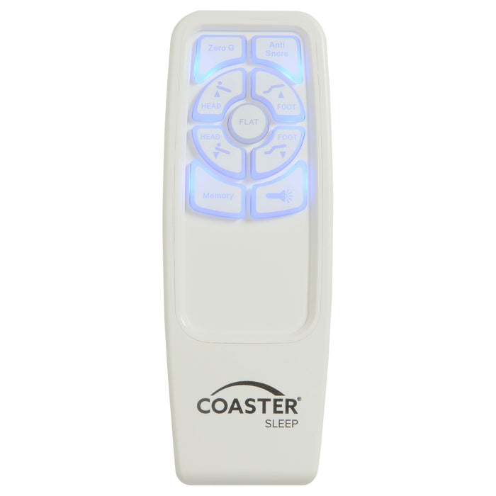 A contemporary California king adjustable bed allows you the freedom of precise positioning to create the relaxing sleep haven of your dreams. Dark gray upholstered rails add a polished touch while six legs adjust in height to suit any bedroom. The bed includes a wireless remote control with pre-set zero gravity, anti-snore, flat and memory positions, in addition to full range head and foot recline. The adjustable bed base is designed for optimal comfort and support, perfect for everything from relaxing with a movie to soothing aches and pains with the position that feels best for you. A stand-alone headboard (not included) may be mounted to the base to create a complete bedroom ensemble and the bed base features power-down functionality in the case of a power failure.